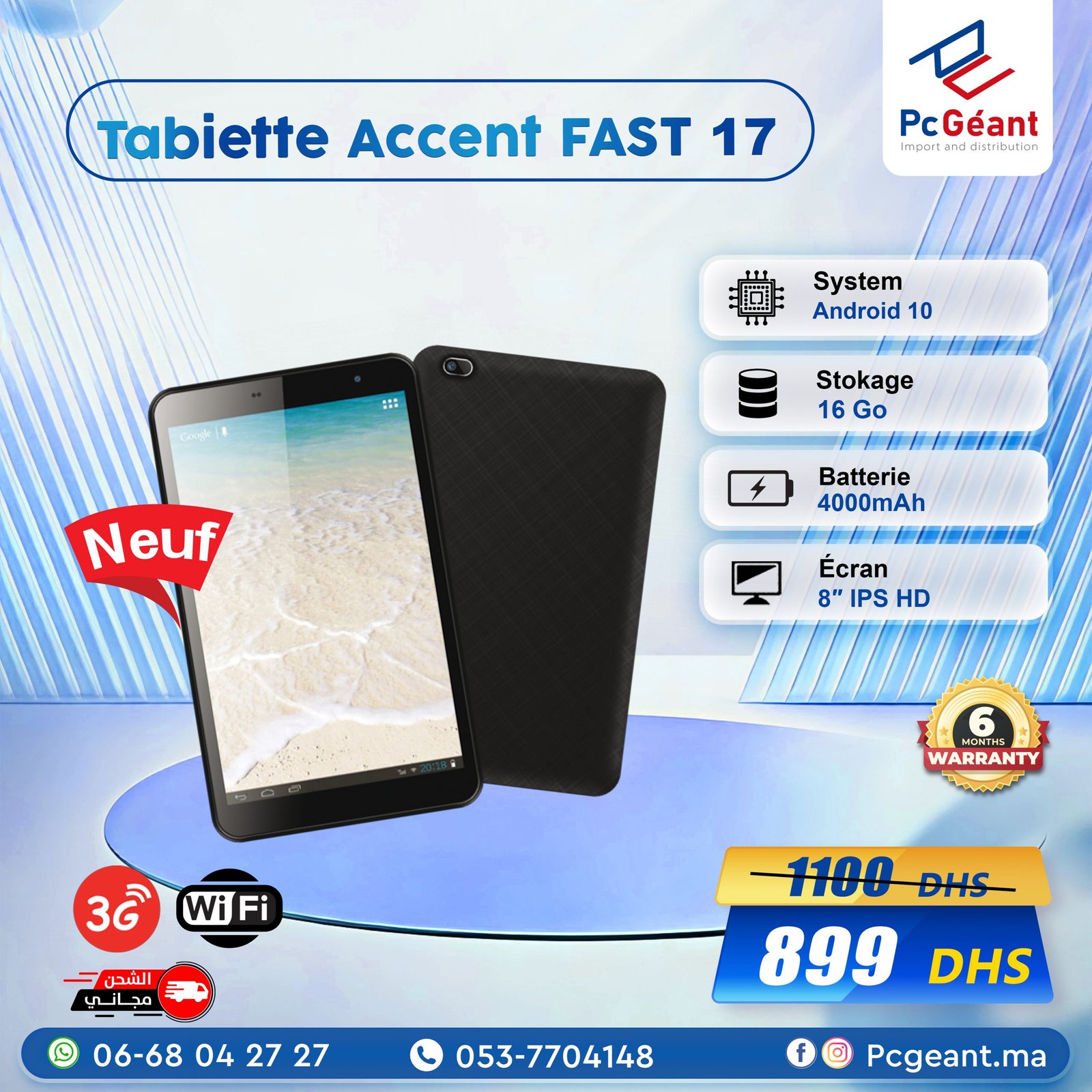 Matériel puissant: un processeur Quad Core et 1Go RAM , 16Gb ROM 8’’ , IPS (1280×800) , Camera 2/5 Mp , Batterie de 4000mAh