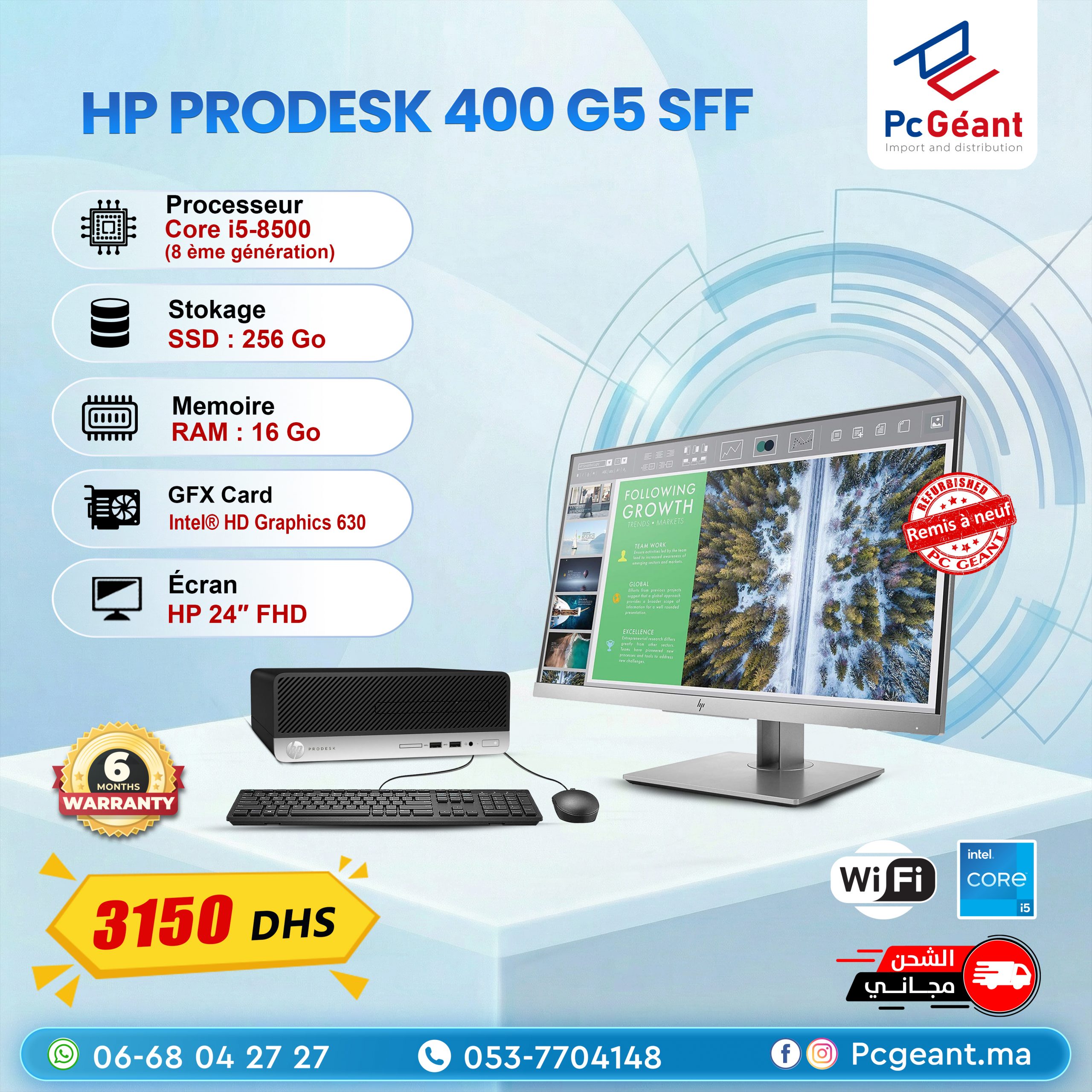- Processeur : Intel® Core™ i5-8500 @ 3.00 GHz Jusqu’à 4.10 GHz Turbo (8 ème génération)